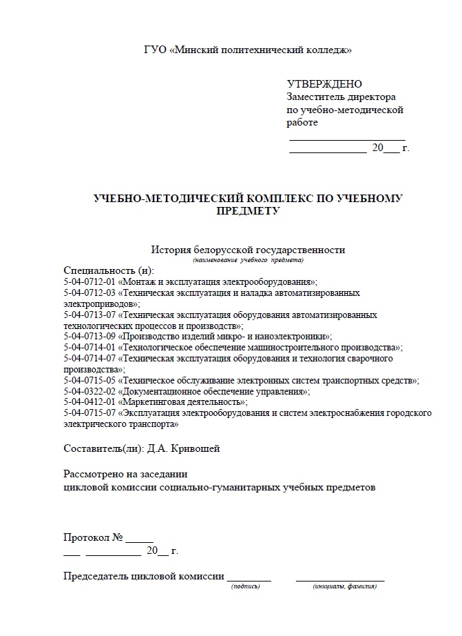 Электронный учебно-методический комплекс по учебному предмету “История белорусской государственности” предназначен для учащихся Государственного учреждения образования “Минский политехнический колледж” осваивающих образовательные программы всех специальностей. Учебно методический комплекс разработан в соответствии с действующими нормативными и методическими документами.